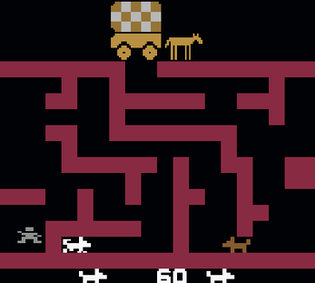 The object of the first maze screen is to move chuckie, the dog, through the maze and escape through the opening at the top of the screen directly below the chuckwagon. If you successfully escape from the maze, you will enter the reward screen.