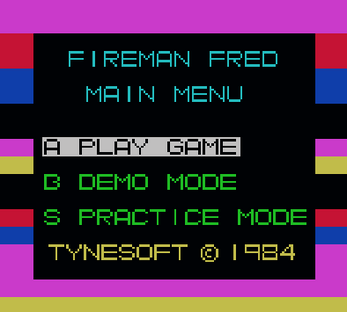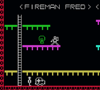 Fred must be very alert as there are many dengers around him - fires, balls of smoke, poisonous spiders, exploding light bulbs and bouncing balls, to name just a few. Your job is to guide Fireman Fred up the ladders and along the floors. To make his job harder, some floors have been burnt or broken away so Fred has to jump the gaps and any other hazards that might get in his way. You must help Fred to rescue the people and the animals, get them down the ladders safety before sending them to hospital in the waiting ambulance. When you have successed on one screen you will go to the next until you have cleared all 20 screens.