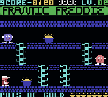Freddie is a telephone line engineer who has to climb up and down the telegraph poles, picking up pots of gold and avoiding the dreaded Greeblies. The Greeblies take on a different form with every new screen, but one thing's for sure - they may look cute, but they show no mercy! Frantic Freddie also features wacky messages, funny interludes and silly bonuses. Frantic Freddie - a game with a sence of humour!