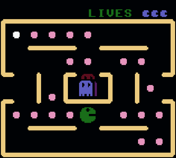 „MUNCH-IT” is a true arcade game. Your task is to move around a maze as quickly as possible, eating the pink food pills as you go. Beware of the three ghosts as they appear from nowhere – they are out to gobble you up! At each level there is a white power pill. On eating this pill you have a short time in which you can go through the ghost but watch out as they will re-appear. You have 3 lives a game and 2 choices of skill speed levels.