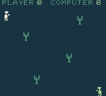 This is a shooting game for 1 or 2 players. Each player has a cowboy with a gun, you must shoot your partner before he shoots you. The first to reach 5 wins. Use the Cacti and passing wagon for cover. Each players score is displayed at the top of the screen.