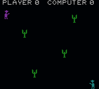 This is a shooting game for 1 or 2 players. Each player has a cowboy with a gun, you must shoot your partner before he shoots you. The first to reach 5 wins. Use the Cacti and passing wagon for cover. Each players score is displayed at the top of the screen.