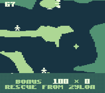 Deep in the mines of Zylon, a team of geologists are trapped. It is up to you to rescue these men in your specially adapted airship, but beware of the acid rain drops which cause you ever increasing damage. Be careful as your airship will be destroyed after the damege point reduced. Damage is reduced by ten point each time a circle item collected - rescuing all geologists (24) successfully and returning to the surface completes one level of which there are eight in total.