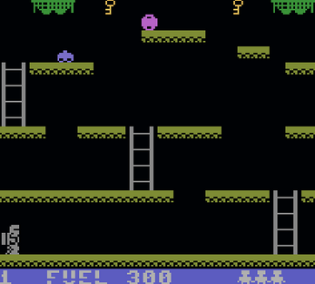 The 10 silver keys have to be collected from their magnetic clips on the roof of each chamber. Beware of the vents on the ceiling which will occasionally deliver boulders, and mutant pods. These will kill you if they touch you. Use the jet-pac to jump some of the larger gaps in the floor. Don't fall through though - the fall could be very bad for you! At the start of the game you can select the difficulty level (1-5), 1 being the easiest. To freeze the game press Select and A to unfreeze.