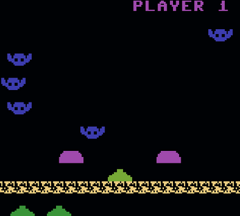 Your only chance of survival is to use your Laser Gun to wipe out those aliens. The only defences you have are two Laser Land Bases behind which you can dodge back and forth, firing your laser and avoiding the Alien’s bombs. Extra Bases for hitting the Space Tube as it blasts across the sky.