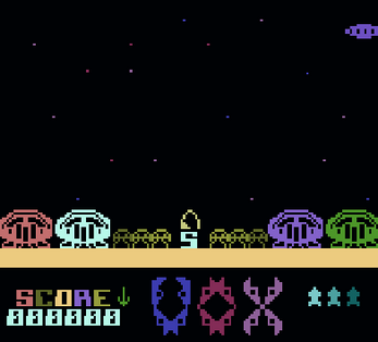 You have to defend the 4 Cities of the planet "VOX" from the alien invasion force. You must destroy the alien craft by moving a sight over the screen and firing guided missiles to sight's location. There are 3 levels. Each level consist of a set number of alien craft but an unlimited number of ammo Saucers and Stunt Planes. To complete a level you must destroy 10 alien bombs.